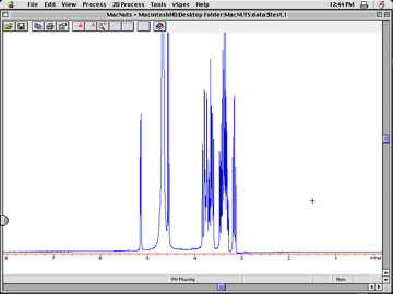 Operations on the NMR spectrum. Whether you imported transformed and phased data, or did the processing yourself, at this point, you should have a pattern that resembles an NMR spectrum. It may have some residual twist in the baseline. The operations performed on transformed data will remove any remaining baseline distortions, find the chemical-shift positions accurately, and measure the peak areas. To learn about the basics of spectrum processing (independent of software used), click here. To access help with a specific NUTS operation, click here. |