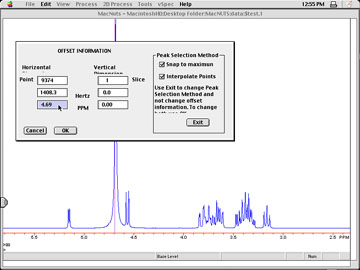 | To set a chemical-shift reference in NUTS, left-click on the appropriate peak and type o while holding the mouse button down, as illustrated below (click here for a larger version). Enter the appropriate chemical-shift value when prompted. | |