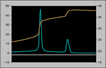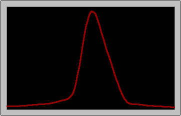 The boxes approximate the shape of the peak. The green integral or integration curve is shown as a cumulative sum of the number of small boxes. In actual practice, the computer system divides the area much more finely than shown here, allowing for better simulation of the peak shape, and a smoother integral curve. Move your mouse over the figure below to view a more typical integral curve: |