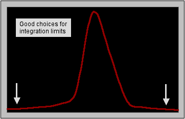 | When measuring a peak integral, the starting and stopping points must be chosen with care. NMR peaks approach the baseline only very gradually, so if possible, the integration limits should be placed a short distance from the peak, in order to insure that as much as possible of the peak is included. Of course, if there are other peaks present in the spectrum, the the choices of starting and ending points may be restricted. The figures below show good and poor selections for integration limits: |