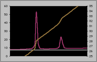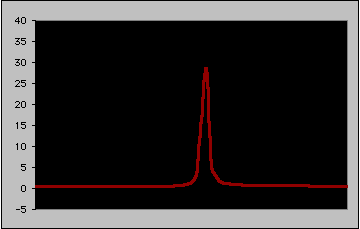 | The areas of NMR resonances are evaluated numerically by the system's computer. The area under the curve is broken up into small blocks, and the number of blocks is added up across the peak. The illustration below shows a crude version of this process for an expanded peak. Move your mouse into and out of the figure below to watch: |