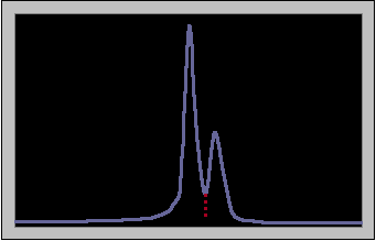 | Severely overlapping peaks provide a special challenge for integration. In an example like that shown below, the only practical way to separate the two is to use a perpendicular to the minimum point as the dividing line, as shown in red. However, this excludes some of the area from each peak, as can be seen when your mouse is positioned over the figure: |