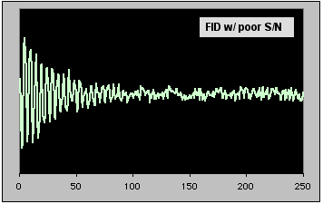 FID's are composed of coherent signal due to the the resonance of the of the nuclei in your sample, and random noise arising from the electronics. To compare an FID of poor signal-to-noise ratio (S/N's) to a better one, move the mouse into and out of the figure areas below. To view the effect on a spectrum, scroll down or click here. |