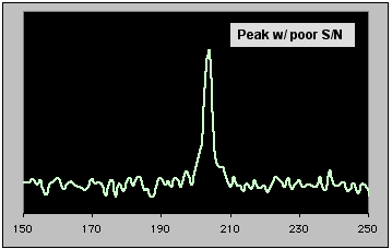 | The spectrum below is a noisy one; move the mouse over the figure to see the S/N improve by a factor of 10. Remember that the better spectrum took 100 times as long to acquire. You should try to achieve the best S/N possible given your time constraints, because noisy spectra can lead to several problems: peak area measurements are subject to larger errors, and small peaks may be missed altogether. |