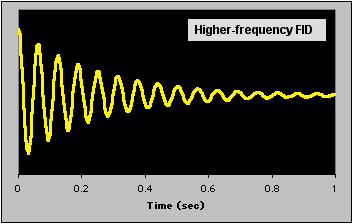 The Fourier Transform (FT) is a mathematical procedure which analyzes an oscillating signal in terms of frequency, intensity, and decay constant. The transformed data are shown in a typical intensity/frequency graph, or spectrum. This procedure is applicable to a wide variety of physical problems, including several spectroscopic techniques. The simulated FID below is clearly made up of one oscillating component, characterized by a frequency, initial intensity, and decay constant. To view its FT, move your mouse into and out of the figure area. |