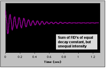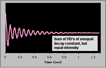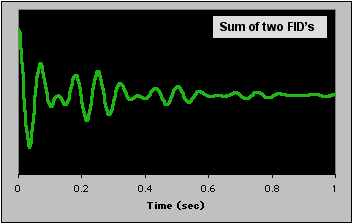 | Real FID's are seldom composed of only one component. In fact, a typical 1H or 13C spectrum can easily contain dozens. As shown earlier, an NMR signal with two components looks like their sum. The signal below is the sum of the blue and yellow FID's above. What will its FT look like? Point to the figure to see. |