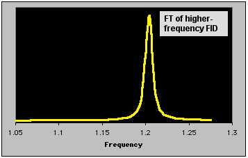 | Not surprisingly, the spectrum contains two peaks - one corresponding to the lower (originally blue) frequency, and one at the higher (originally yellow). Two other important features should be noted. The peaks are of roughly equal intensity, because the two components were equally weighted. Also, their widths are the same; this arises from the fact that the decay constants are identical. In a real spectrum, these two conditions rarely hold. |