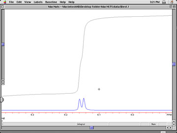 This problem is caused by a spectrum baseline that is either sloping across the spectrum, or has some curvature to it. Make sure that you have performed a baseline correction (bc) operation on your data after the Fourier Transform, but before you set a chemical-shift reference, do a peak pick, or attempt integration. If you have performed a baseline correction, but your integral baselines are still not flat, they must be processed further. You will make both zero-order (linear) and first-order (curved) adjustments. Enter this routine from the Integral level of NUTS (type id if you are not already there) by typing b. You will notice that your preset integration limits will be ignored. Do not be concerned; they will return when the correction routine is done. In practice, it is easier to make the first-order correction first. Move the mouse to the right and/or left while holding down the right button to remove any curvature in the integral trace. Do not worry if the baseline slopes linearly across the peak; this will be corrected in the next step. The images below show an example. Move your mouse over the figure to see the effect of a first-order correction (click here for larger pictures). |