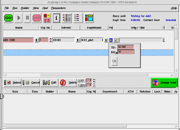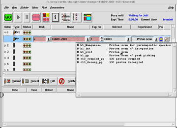 | Click on the dialog box button, as shown below (click to view larger screen), to change any experimental parameters you have control over. NMR-CTP participants will, in general, only be able to alter NS, the number of scans. This value should be changed only if it is known that the default value will not yield a sufficiently high signal-to-noise ratio (S/N). | ||||