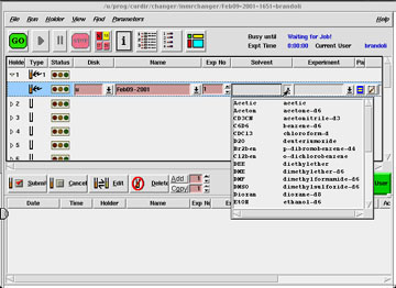 | Select the deuterated solvent used to prepare your sample. Be certain to choose the correct solvent; chemical-shift errors will result from an incorrect selection. Click on the arrow to the right of the solvent box, and scroll down to the appropriate choice. Roll your mouse over the screen below to see this procedure (click here for larger versions) | ||||
