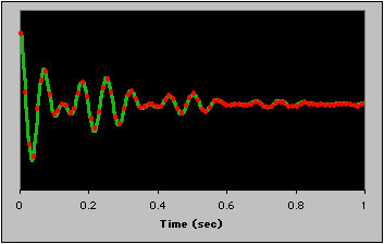| NMR signals are recorded digitally, i.e., as a series of discrete, evenly spaced data points, rather than as a continuous stream of information. It is critical to collect sufficient data points so that the signal can be accurately represented. The example below shows a curve that is well-defined, in spite of the fact that there are relatively few points (an actual NMR experiment would use many, many more); all of the maxima and minima are included, and subtle, small oscillations are also captured. Position your mouse over the image to view a data described by too few points; it would be impossible to accurately reconstruct the original signal from this information. | |||||