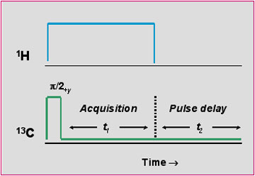 This sequence exploits the fact that the NOE requires time to develop, whereas decoupling takes places instantaneously. The decoupler is only on during the relatively short acquisition period, not during the much longer pulse delay (these time periods are not shown to scale in the figure above). In this way, there is insufficient time for an appreciable NOE to develop, but the resonances are still completely J-decoupled. The decoupler should always be gated whenever highly accurate quantitation of peak areas is desired. |