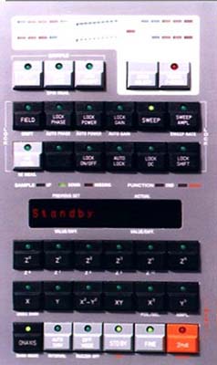 | This panel of controls is located near the main spectrometer computer. Before you log into ICON-NMR, the red LED display should read "Standby". If it does not, press the light gray STDBY button. It is the fourth from the left in the bottom row. | ||||