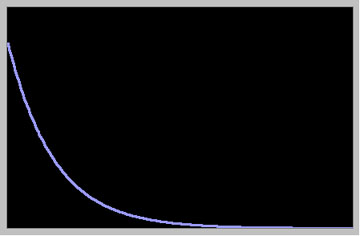 If a nucleus were precessing at exactly the Larmor frequency, we would see it decay smoothly from a maximum, right after the pulse, back to the starting position. The intensity would be a plot of the decrease in the size of the projection (shadow) of the magnetization as it lifts out of the x-y plane. The observed signal would look like the curve shown below; this is referred to as the on-resonance condition: |