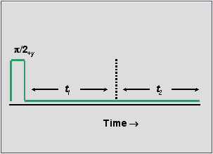 | This diagram provides a spectroscopist with enough information to allow her or him to program the spectrometer with the appropriate timing parameters, although this doesn't need to be done very often, since a wide variety of standard sequences is included with all modern instruments. Appropriate values of the pulse width, t1, and t2 are simply entered into the operating software. | ||||||